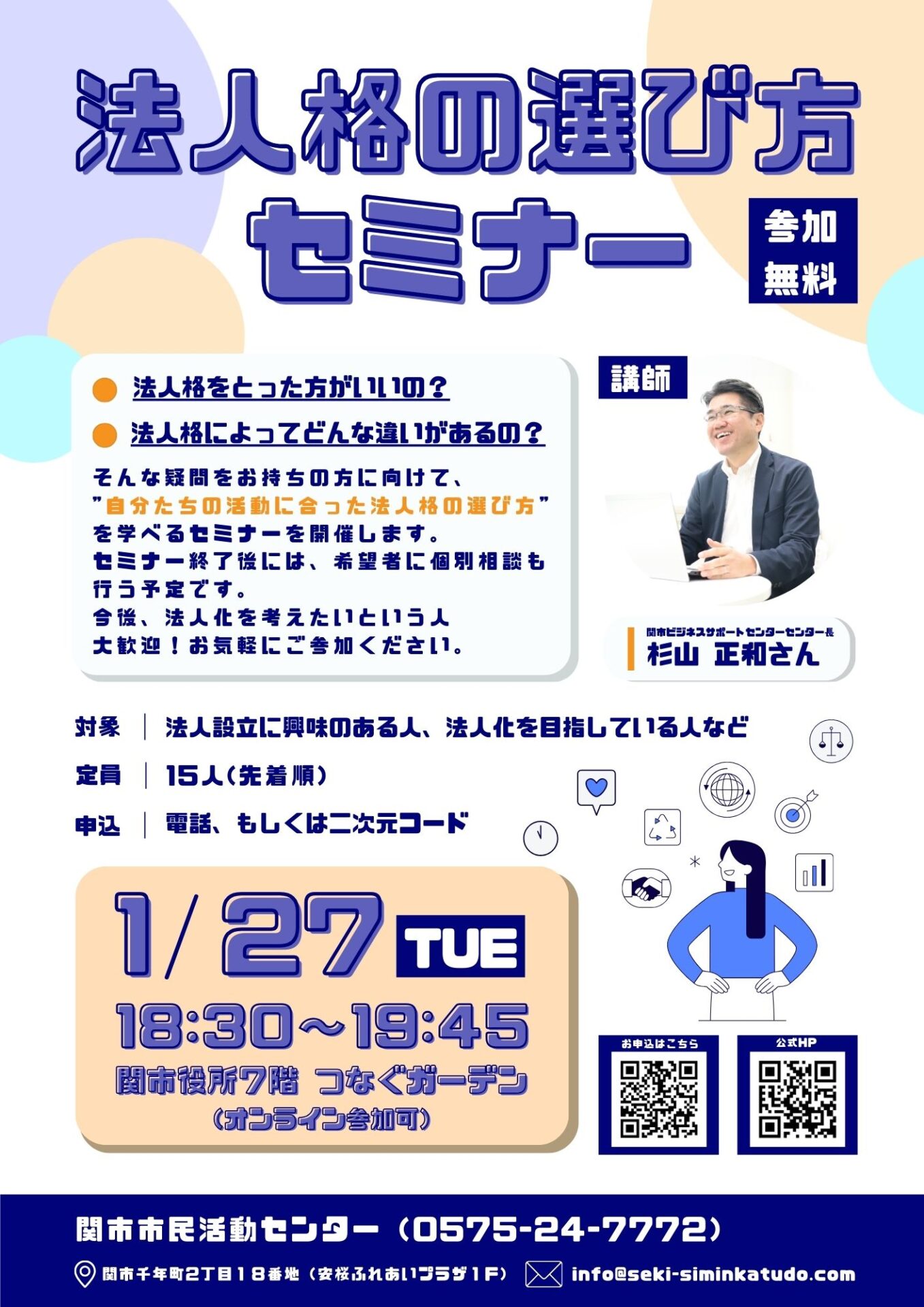 申し込み:申し込みフォームまたは関市市民活動センター (0575-24-7772)までお電話ください。