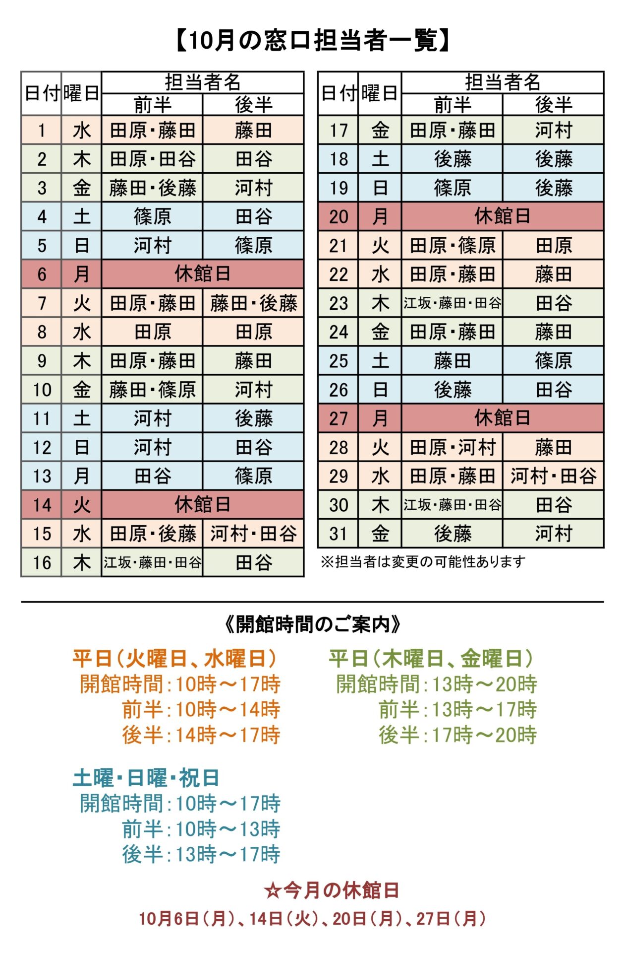 今月の開館時間と窓口担当者 火、水:10時から17時 木、金:13時から20時 土、日、祝:10時から17時休館日:毎週月曜日、祝日の翌日、年末年始等 2025年10月の窓口担当者 スタッフ紹介はこちら 相談予約はこちらから