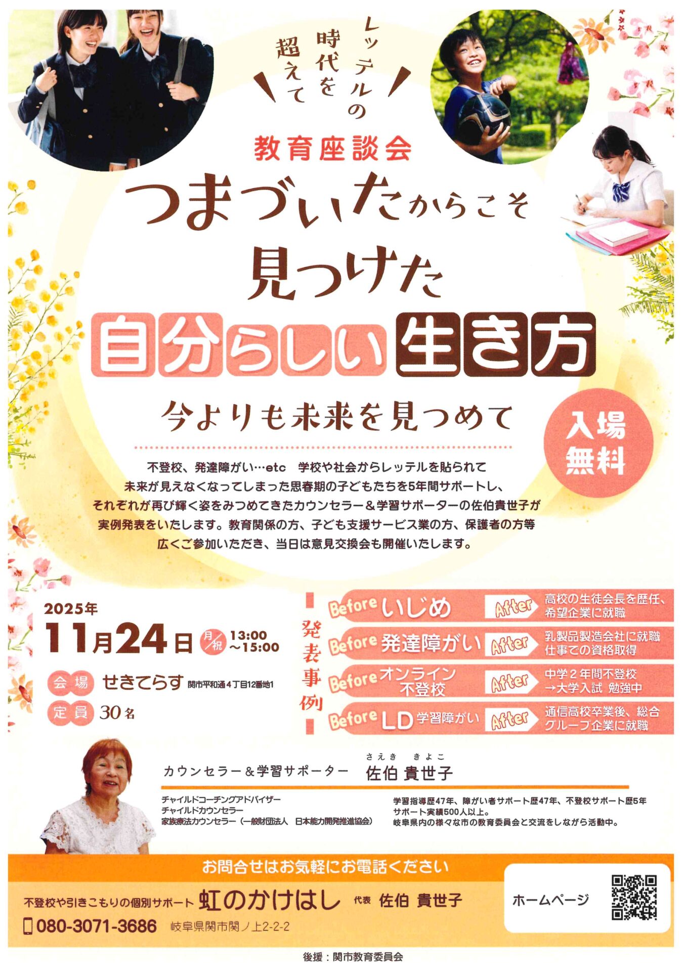 カウンセラー&学習サポーターである佐伯貴世子様が今までサポートしてきた子どもの実例発表を行われます!当日は意見交換会も開催されます!