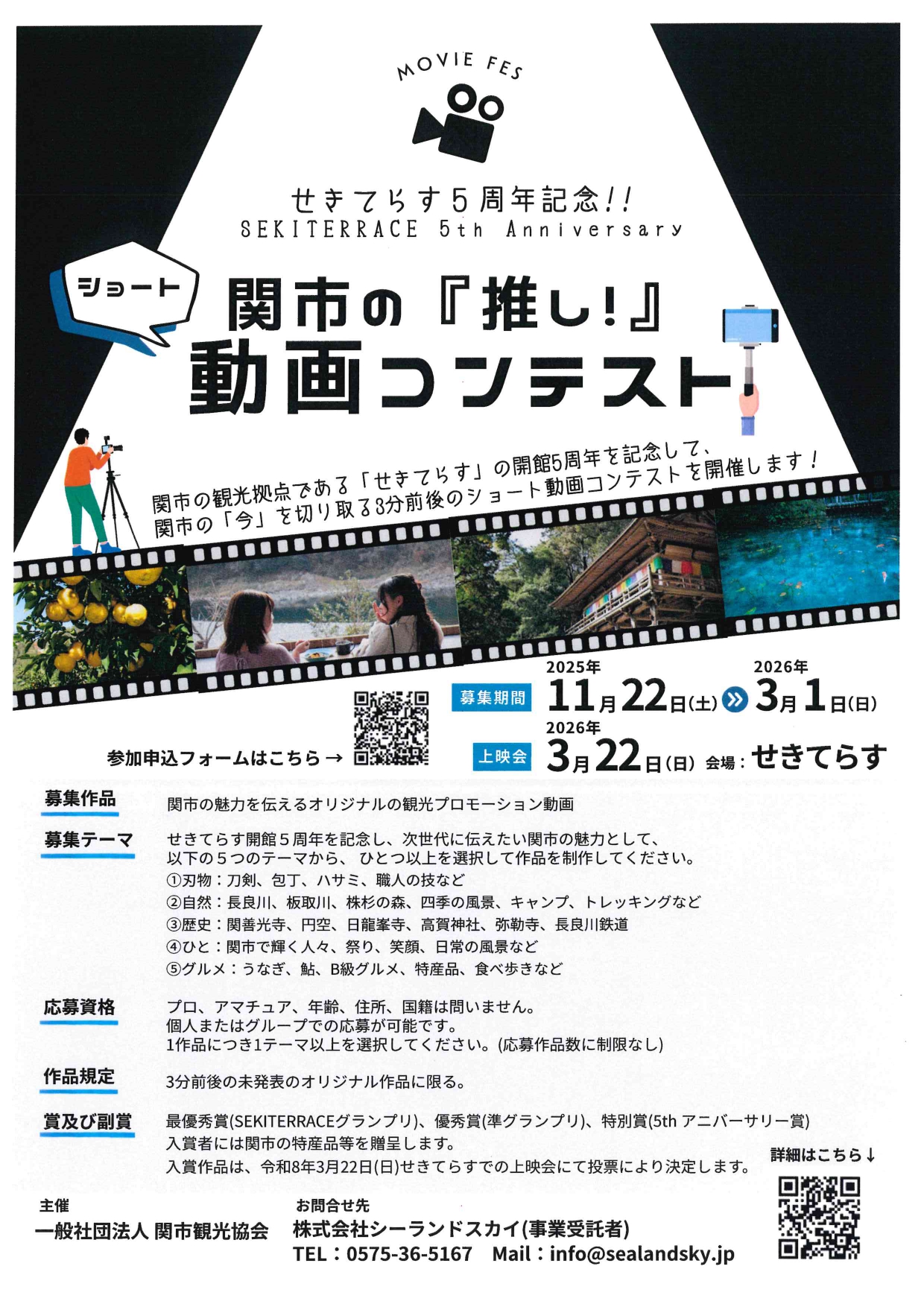 関市の観光の拠点である「せきてらす」の開館5周年を記念して、関市の「今」を切り取る3分前後のショート動画コンテスト開催します!