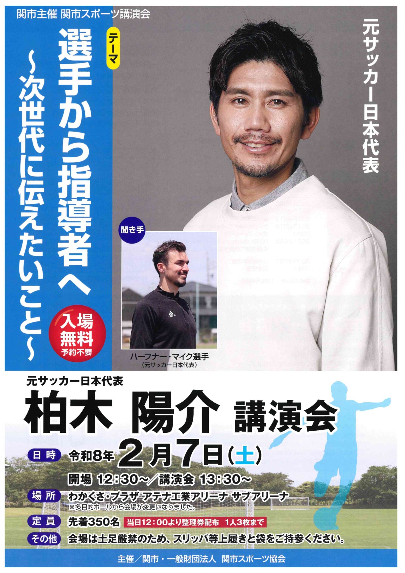 聞き手に「ハーフナー・マイク」選手を呼び、次世代に伝えたいことをテーマにした講演会が行われます!申込予約不要です!