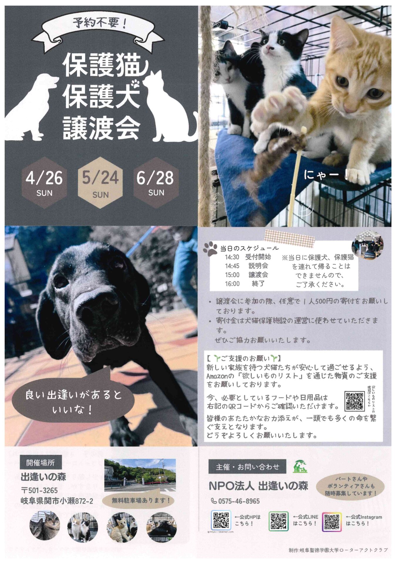 譲渡会に参加の際、任意で1人500円の寄付をお願いしています。保護施設での運営に使わせて頂きます。