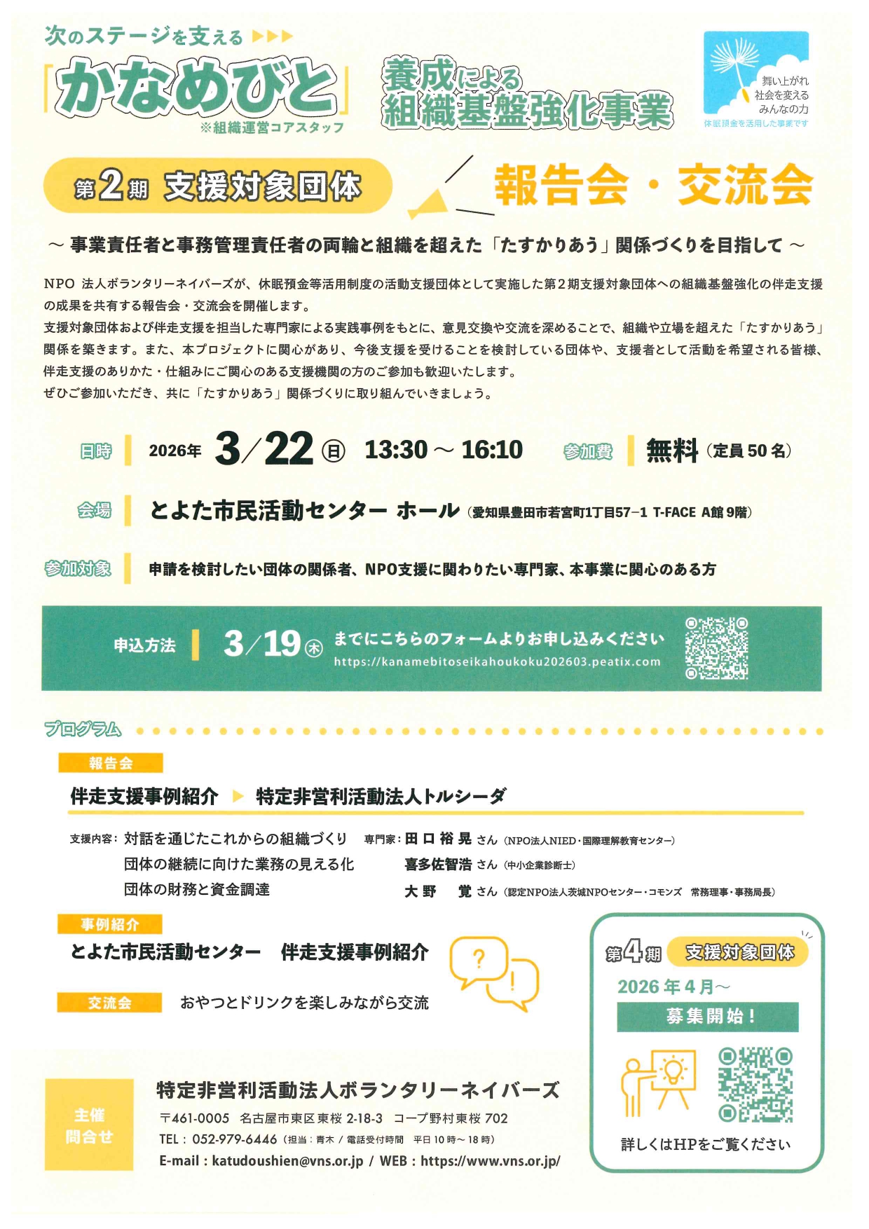 参加対象:申請を検討したい団体の関係者、NPO支援に関わりたい専門家、本事業に関心のある方