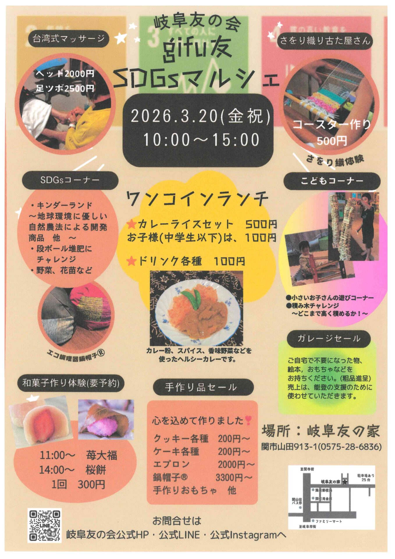 内容:台湾式マッサージ、さをり織り古た屋さん、SDGsコーナー、ワンコインランチセット、こどもコーナー、和菓子作り体験(要予約)、手作り品セール、ガレージセール
